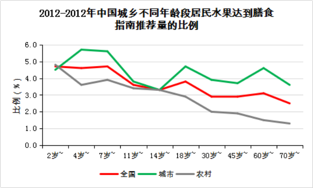 我国居民水果消费量随年龄增长呈逐渐减少的趋势,男性以11-13岁组最高,为42.4克,随后下降并维持着30克左右;女性以14-17岁组最高,之后随年龄增加消费量逐渐下降,70岁以上组最低,为25.3克。达到水果推荐量的比例也随年龄增加而下降,2-3岁组最高,为4.7%,70岁以上年龄组最低,为2.5%。