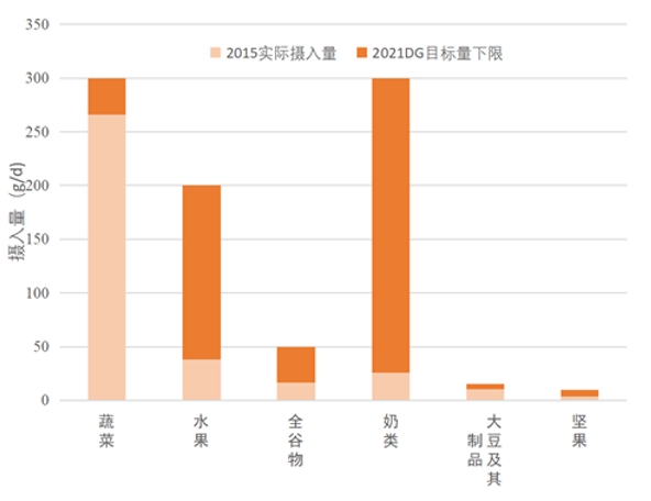 据2015年中国成人慢性病与营养监测数据显示,每标准人日蔬菜、水果、全谷物、奶类、大豆及坚果类的平均摄入量分别为265.9g、38.1g、16.3g、25.9g和13.9g,均低于目前中国居民膳食指南的建议摄入量(图3)。
