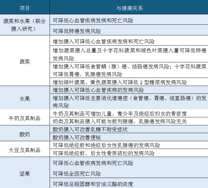 表2 蔬菜、水果、奶类及其制品、大豆及其制品和坚果与健康的关系
