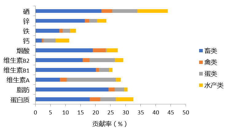 畜禽类、蛋类和水产品是膳食蛋白质、脂肪、维生素A、B族维生素和矿物质的良好来源。鱼、禽、蛋类和畜肉在膳食满足人体对营养素的需要中占有重要地位。按照2015—2017年中国营养与健康状况监测数据,计算畜、禽、鱼、蛋类食物所提供的主要营养素对膳食营养素的贡献率,结果见图2。