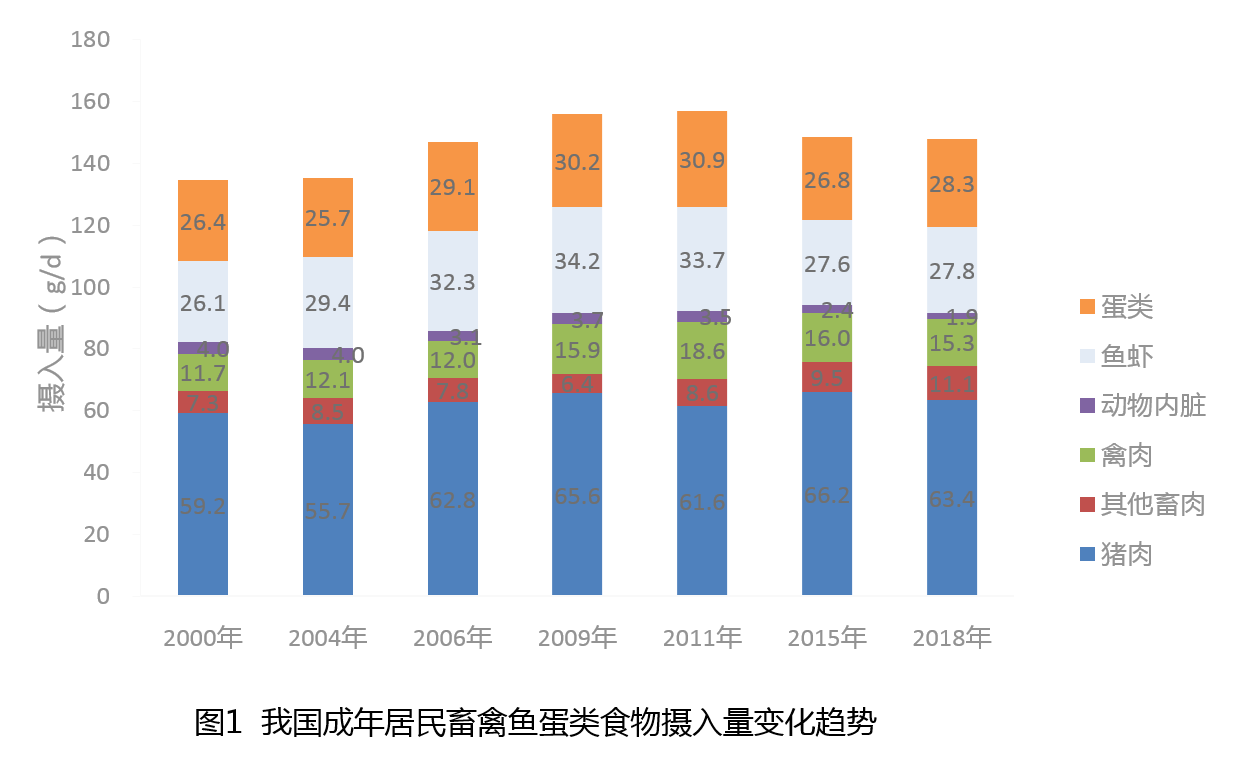 从1982年至今的营养调查资料显示,我国居民肉类食品摄入量逐年增高。与2010—2012年监测结果比较,近5~8年间变化不大。另一项来自中国健康与营养调查(CHNS)同样显示,从2000年到2018年,我国成人居民畜、禽、鱼、蛋类食物摄入量保持相对稳定水平(图1)。