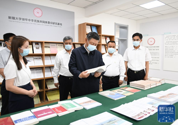 ▲7月12日至15日,中共中央总书记、国家主席、中央军委主席习近平在新疆考察。这是12日下午,习近平在新疆大学铸牢中华民族共同体意识研究基地考察。新华社记者 谢环驰 摄