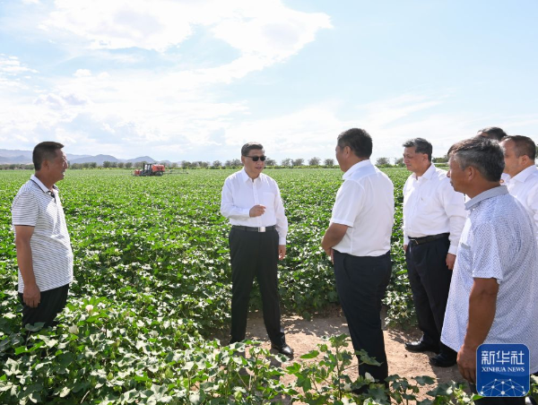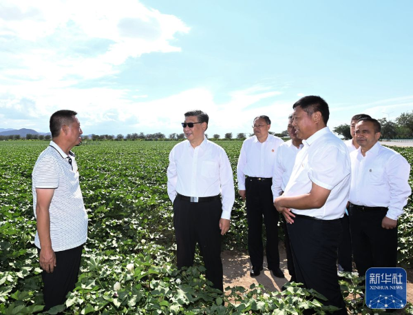 ▲7月12日至15日,中共中央总书记、国家主席、中央军委主席习近平在新疆考察。这是13日下午,习近平在新疆生产建设兵团八师一四三团农一连棉花种植基地考察。新华社记者 谢环驰 摄