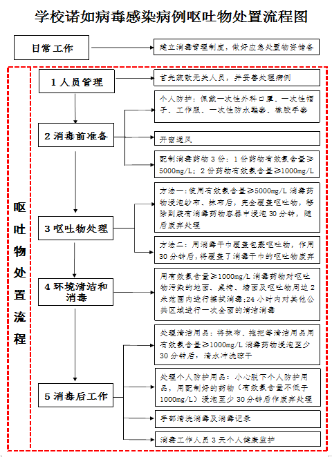 当学校及托幼机构发生诺如病毒感染等感染性腹泻病例呕吐时,应由接受过培训的教职员工参照下述流程进行规范处置,不得由儿童(学生)执行,严防因处置不当造成病毒扩散和疫情蔓延。若呕吐原因暂时不明,参照此指引规范处置。
