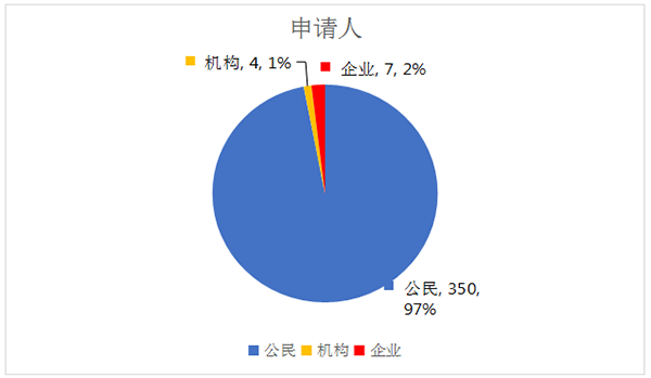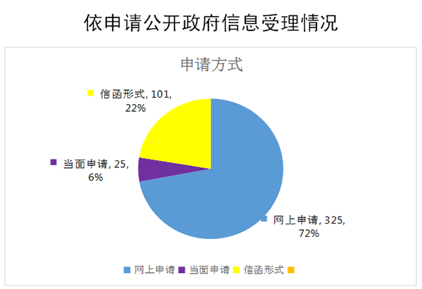 经审查,361件申请中,无效申请1件,主动撤销8件。在办理的352件申请中,“同意公开”的205件,占58.24%;同意“部分公开”的2件;“非《条例》所指政府信息”的28件;“不予公开”的0件;“不符合一事一申请原则”的2件;“重复申请”的6件;“信息不存在”的47件;“非本机关职权范围”的24件;“更改、补正”的11件;属于“主动公开”的23件;“告知通过其他途径办理”的4件。其中食品安全企业标准备案信息依然是申请公开的主要内容,占59.83%,医政信息占18.83%,其他信息占21.34%。全部依法依规按时答复并及时录入到广东省政府信息依申请公开系统。